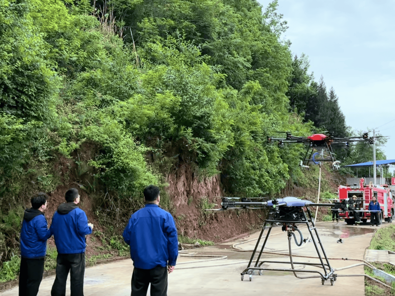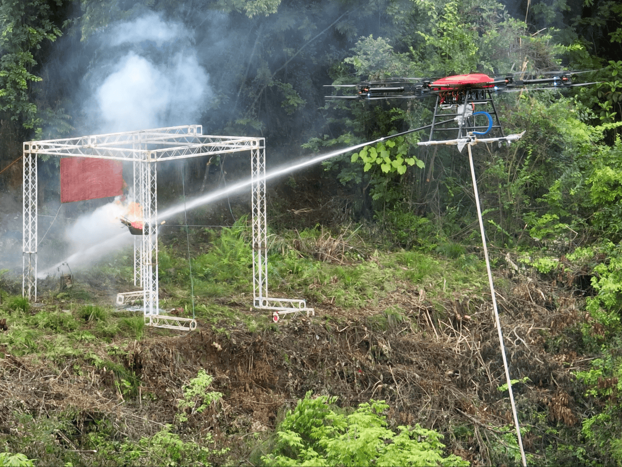本次演练由营山县人民政府主办,模拟县域内突发山洪地灾、水上险情、地震灾害及森林火情等多重叠加的复杂应急场景,全面检验多部门协同处置能力。在森林火灾扑救环节,沃洛佳科技无人机编队凭借优异的飞行与挂载性能,依次完成升空悬停、挂载破窗器作业、水带精准灭火等一系列高难度实操动作。