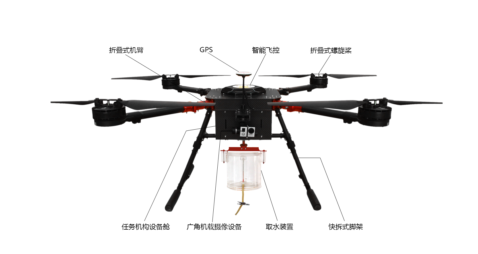 通过无线远程控制任务机构,飞往目标水域进行采样作业,可无视地形环境等障碍,做到精准高效采样,解决了当前传统人工采样受地形和环境限制的问题,提高了采样效率,保证采样人员的人身安全。该产品采样精准、航时长,抗风雨性好,不受地形和环境的限制、操作简单、携带方便、安全可靠。