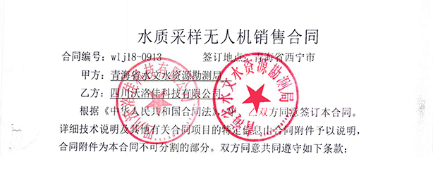 9月17日四川沃洛佳科技有限公司与青海省水文水资源勘测局正式签订了“水质自动采样无人机”购买合同,并于10月17日正式完成机子交付。