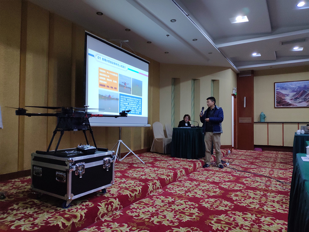 在此次讲座中四川沃洛佳科技有限公司技术负责人颜佳给省局各领导具体介绍了公司自主研发的WLJ-X4A水质自动采样无人机,“该无人机是利用无人机技术实现水体的远程采样功能,可广泛应用于水质监测、水生态监测、 水环境突发事故监测及灾后监测等领域,同时得益于产品机载的高清图像传输设备,在取得水样的同时,全程空中记录采样过程及周边环境的影像资料,使样本数据据更加丰富全面。该无人机的主要优势是安全(无需工作人员到达确定取样地点,保证人身安全)、精准(智能飞控的运用可实现定位定深取样)、高效(整个取样过程大约三分钟左右)”。