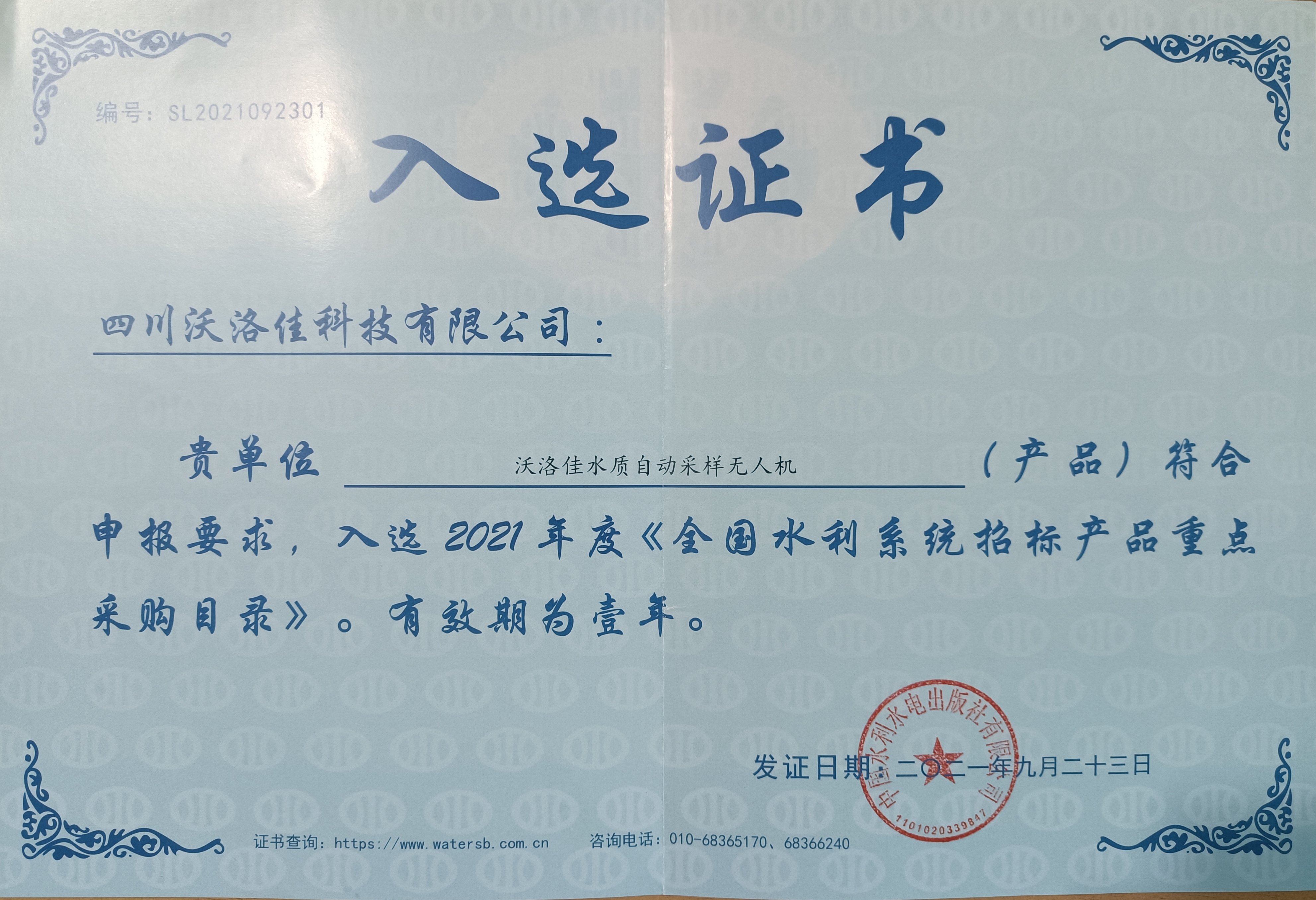 2021年9月23日,沃洛佳水质自动采样无人机符合申报要求,成功入选《全国水利系统招标产品重点采购目录》!!!