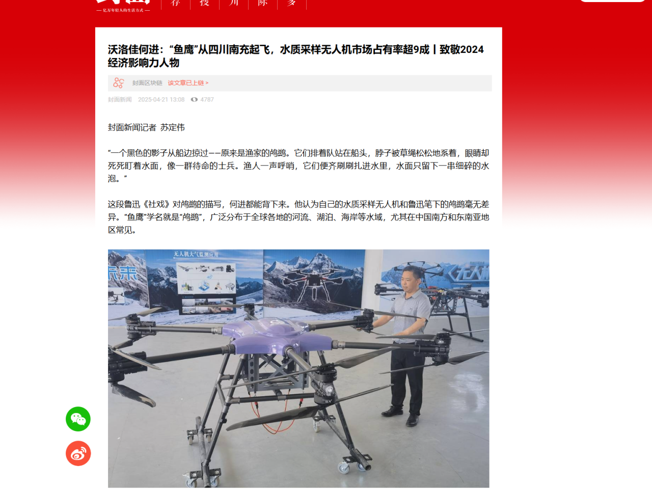 2025年4月21日,封面新闻——细说我司“鱼鹰”无人机到多功能重载无人机发展历程,从行业跨度到时间机遇的过程中,“沃洛佳”在稳住水质无人机基本盘的同时,开始了新的技术攻关,瞄准应急救援、城市物流配送等领域,研发多功能重载无人机CS系列!