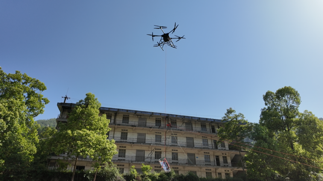 在救援行动中,我司自主研发“CS100” 多功能载重无人机大放异彩。面对自然灾害危房垮塌救援的复杂场景,它凭借卓越的性能,将搭载伤员的担架精准悬停投送至救援作业的消防员手中;同时,以高效稳定的作业能力,迅速完成急救物资的定点投送任务,“CS100”强大的实战应用价值,为快速打开生命救援通道争分夺秒,赢得了最快抢救的宝贵时间。
