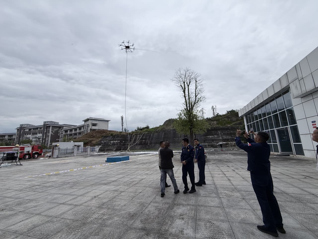 此次调研重点聚焦于消防无人机的实战演示环节。现场,李代明副总队长一行观摩了两款主力机型的实际演示:CS100 消防无人机精准完成灭火弹投掷,动作流畅、响应迅速;CS200 消防无人机顺利携消防水带展开作业,喷水与泡沫喷射覆盖范围广、力度均匀。无人机作业飞行高度可达100多米,充分展现了其在持续压制火势方面的突出性能。