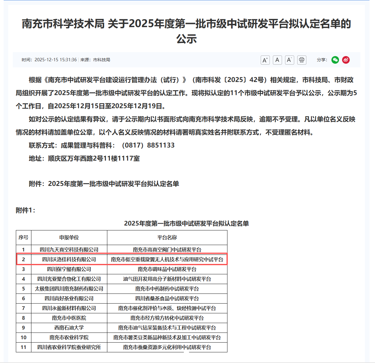 近日,南充市科技局、财政局对2025年度第一批市级中试研发平台认定结果进行公示,四川沃洛佳科技有限公司申报的“南充市低空重载旋翼无人机技术与应用研究中试平台”成功入围拟认定名单。