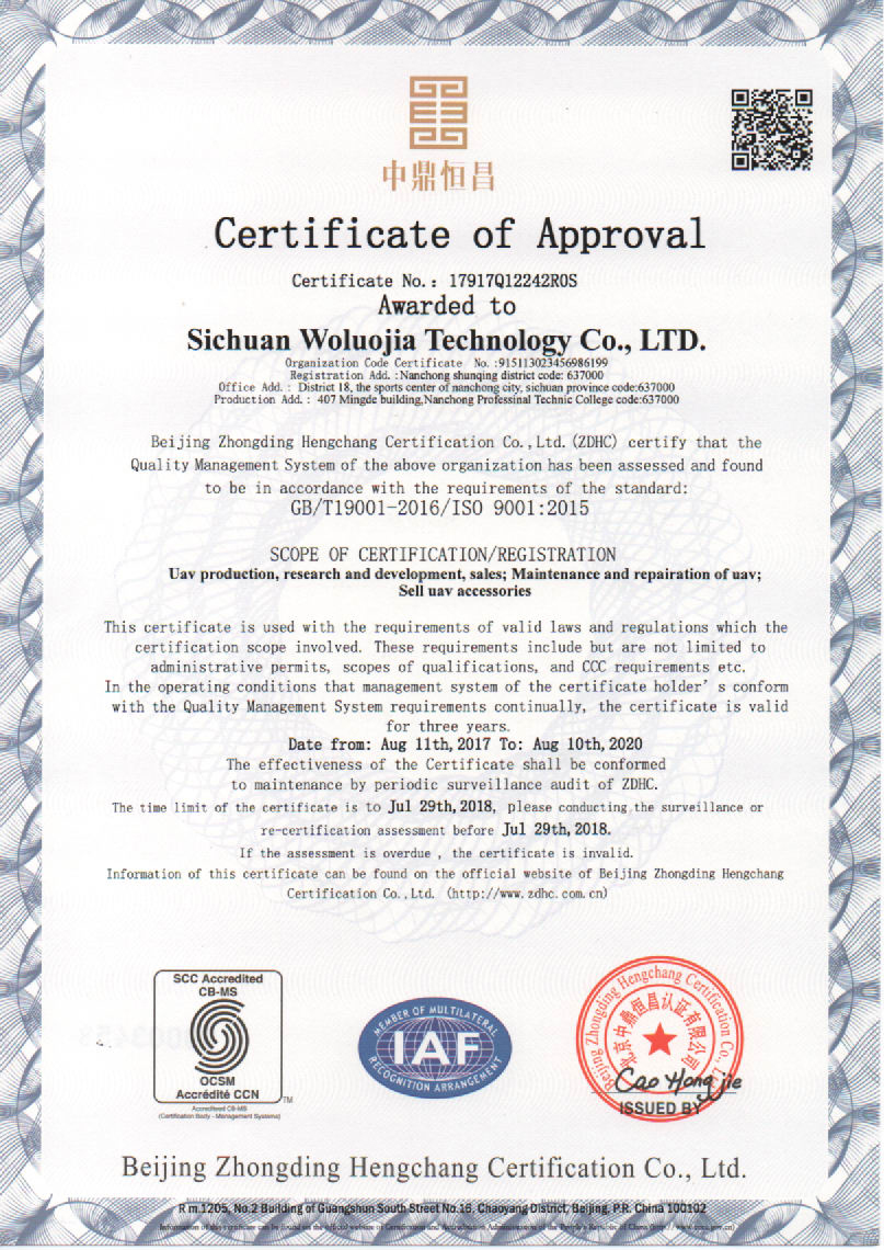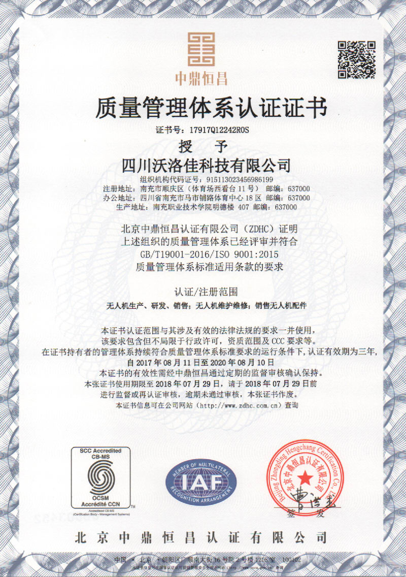 四川沃洛佳科技有限公司于2017年8月11日顺利通过ISO9002质量管理体系认证,本次认证有效期为三年(2017年8月11日-2020年8月10日),认证/注册范围为无人机生产/研发/销售;无人机维护/维修;销售无人机配件。能顺利通过此项认证,表明我公司具有提供达到顾客要求和适用法规要求的产品的能力。